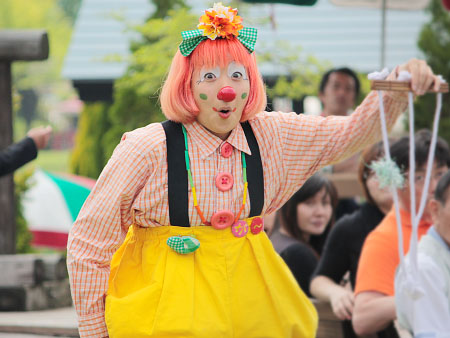 芝生広場の特設ステージでクラウンさんが得意のパフォーマンスで楽しませてくれます。