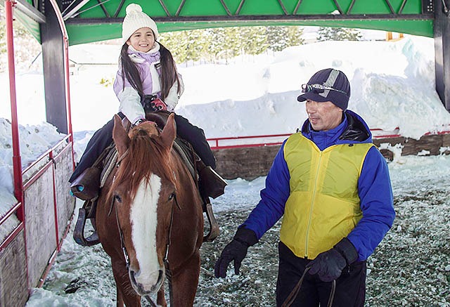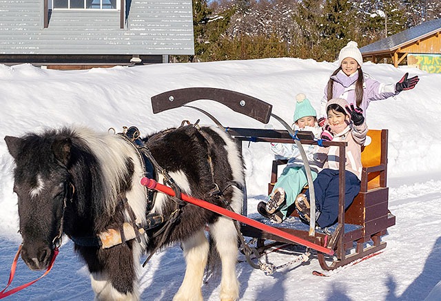 雪上をポニーに引かれてのーんびり。雪国気分を満喫してね。
