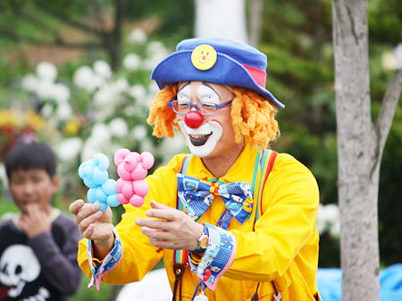 芝生広場の特設ステージでクラウンさんが得意のパフォーマンスで楽しませてくれます。